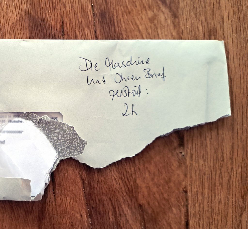 Jemand von der Post hat sich die Mühe gemacht, das Maleur mit dem Brief zu erklären. Handschriftlich! Wahrscheinlich ist das der Job. Okay. Was aber wäre passiert, wenn da nichts stünde? Das zerfledderte Ding einfach so angekommen wäre, unkommentiert? Unverständnis, Missmut, gar Aggression! So aber geht doch bisschen das Herz auf, oder? Eine Entschuldigung hätte die Sache rund gemacht. Nach diesem Kurs wissen Sie das